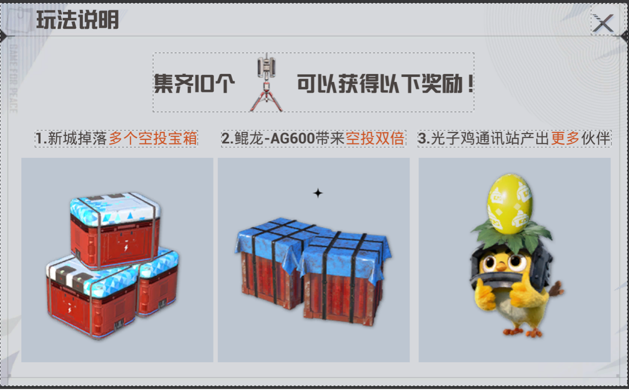 “特种兵”们在集齐20枚信标后就可在初生岛看见鲲龙-AG600鲲龙展翅身影,并在开局后有机会拾取鲲龙AG600投送的双倍空投物资,新城也将掉落多个空投宝箱。除此之外,光子鸡通讯站也将产出更多伙伴,为大家带来更热血的竞技体验。
