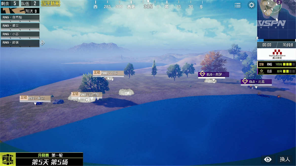 第六阶段后期,RSG与Tianba交锋,ELG占据侧面山头打靶Tianba,没有太多掩体的Tianba被ELG打靶淘汰,RSG仅剩一人被ELG打靶淘汰。第七阶段,ELG与RNG展开决战,RNG率先打靶淘汰ELG一人,RNG占据人数优势不断贴近ELG防线,双方在没有掩体的海岸线僵持到第九阶段,最终RNG将ELG淘汰拿下本场比赛的胜利。