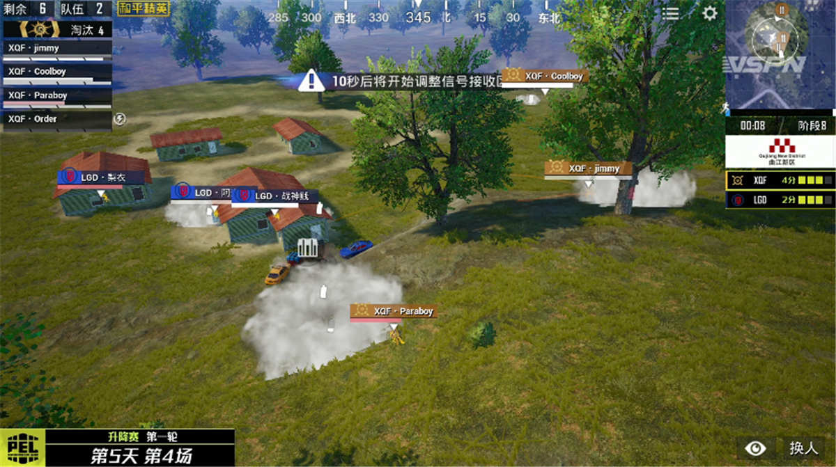 第七阶段中期,LGD将仅剩一人的RNG淘汰,随后LGD将同样仅剩一人的RSG淘汰。XQF与LGD展开最终的决战,XQF占据高点强冲处于房区的LGD,在第八阶段中期,XQF成功将LGD淘汰拿下本场比赛的胜利。