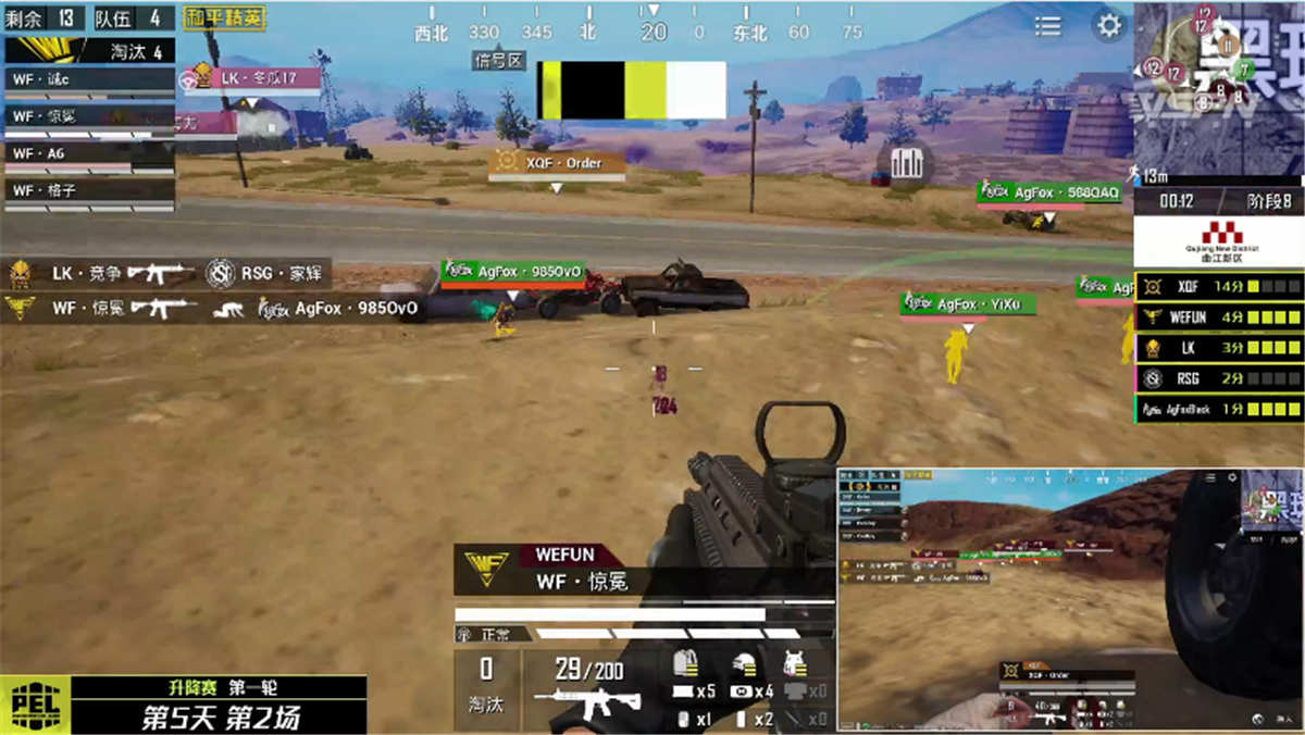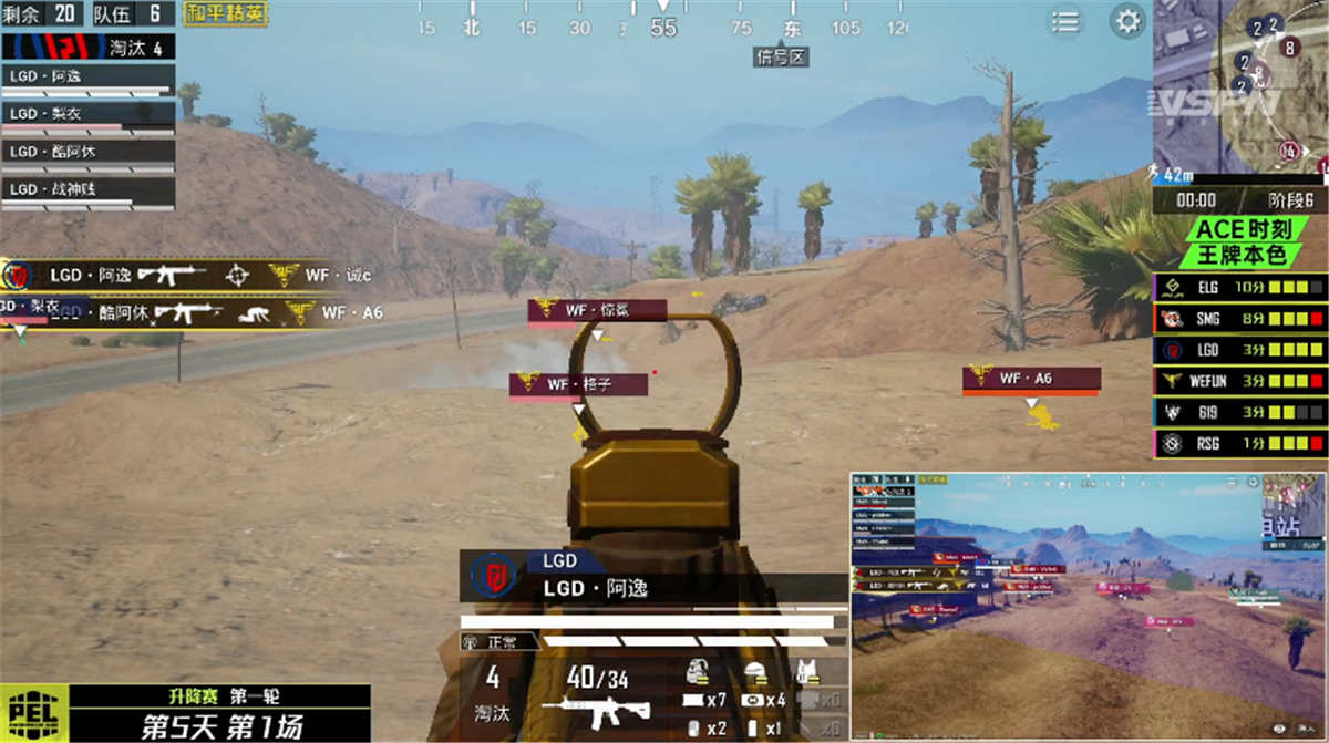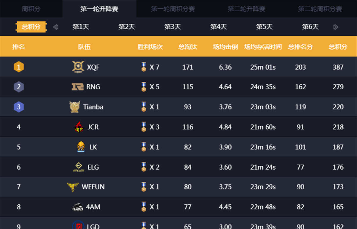 第四阶段,LK、AgFoxBlack、RNG三队乱战,AgFoxBlack占据高点,RNG占据房区最先将LK淘汰。第五阶段,ELG与AG交锋,ELG占据高点成功将AG淘汰。第五阶段后期,SMG正面阻击AgFoxBlack,周围多支队伍同时打靶AgFoxBlack,AgFoxBlack惨被淘汰。第六阶段,LGD与WF正面交锋,LGD成功将WF淘汰。