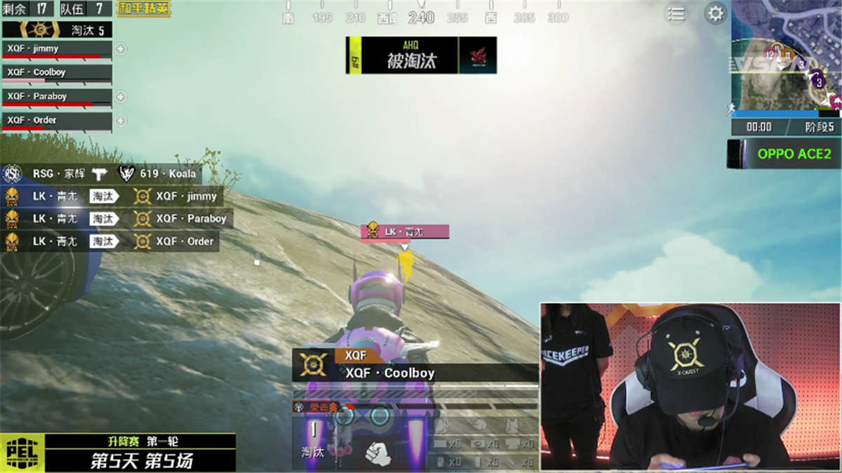 第五阶段,LK与LGD在野外交锋,LK占据高点成功将LGD淘汰,XQF随后赶到战场与LK交火,LK·青尢一穿四将XQF团灭,ELG随后赶到战场强冲占据高点的LK,LK仅剩一人在转移的过程中被RNG打靶淘汰。